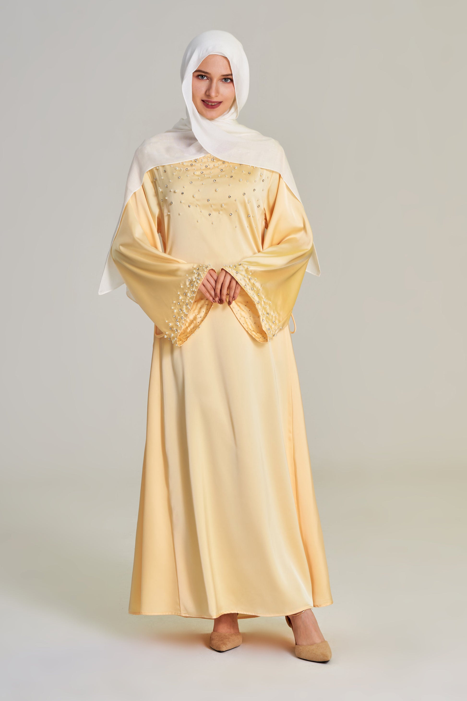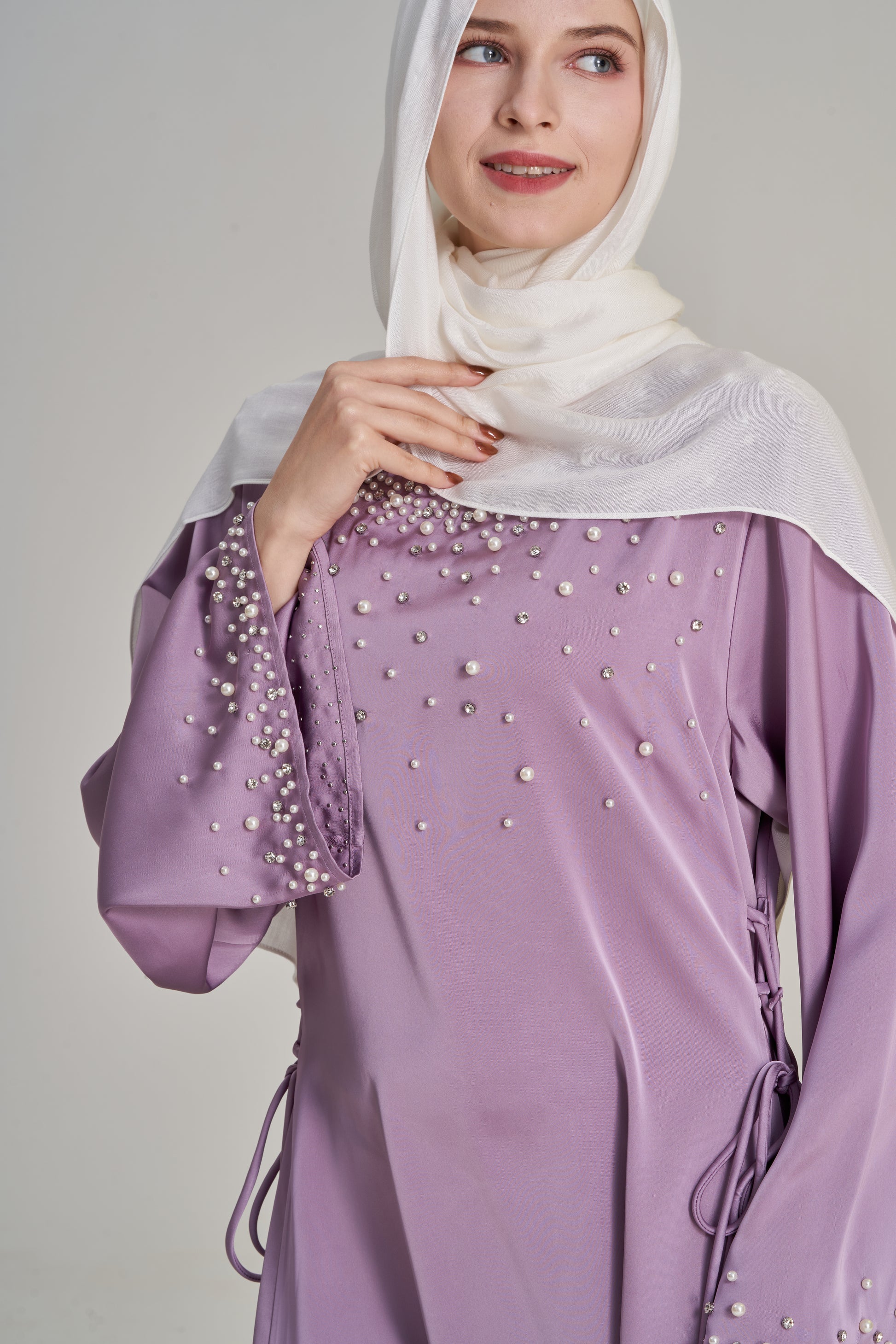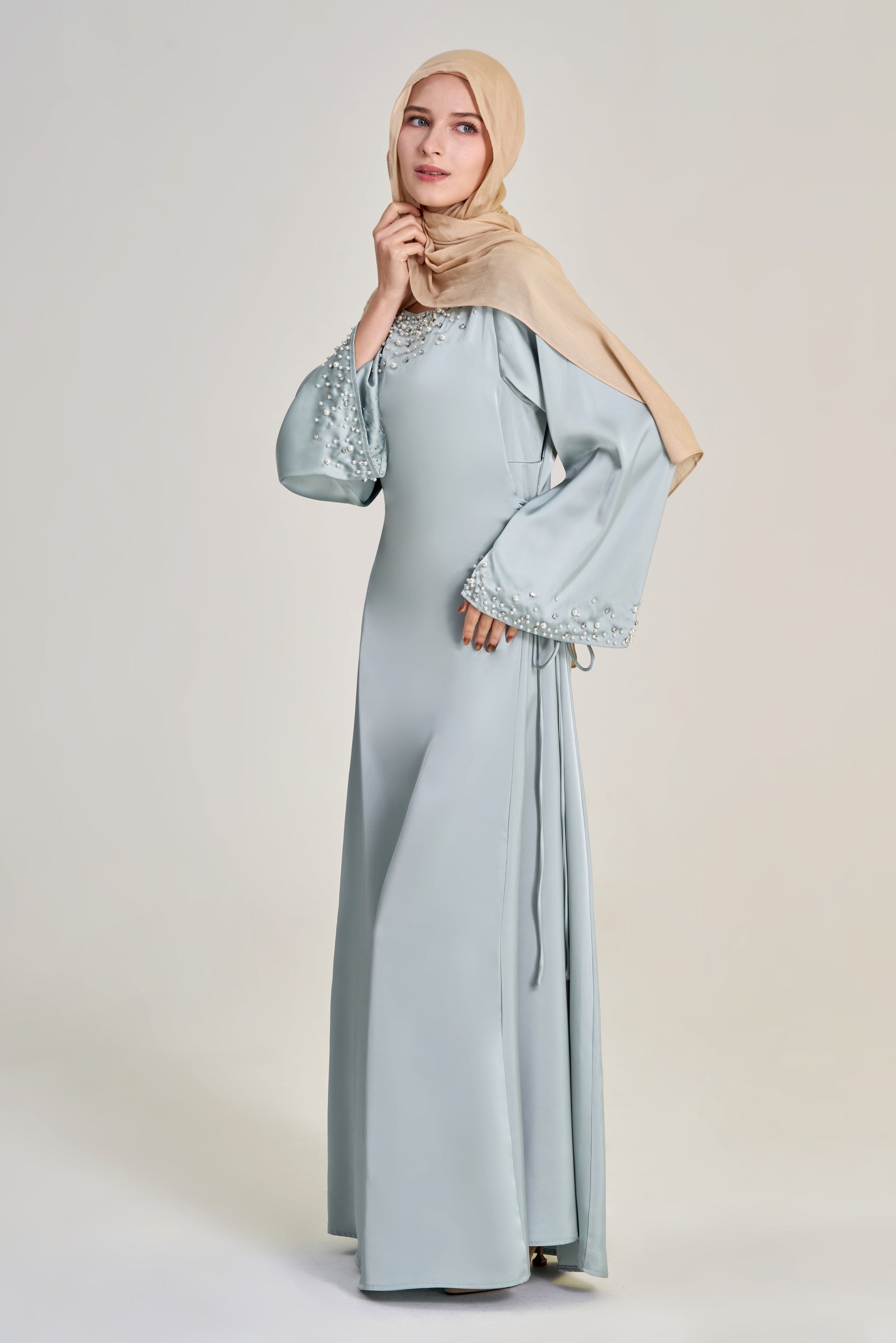 A full-length dress featuring wide draped sleeves, rhinestone and pearl detailing, and adjustable side-tie strings that cinch the waist for a flattering silhouette. Designed for graceful movement and timeless modest wear.