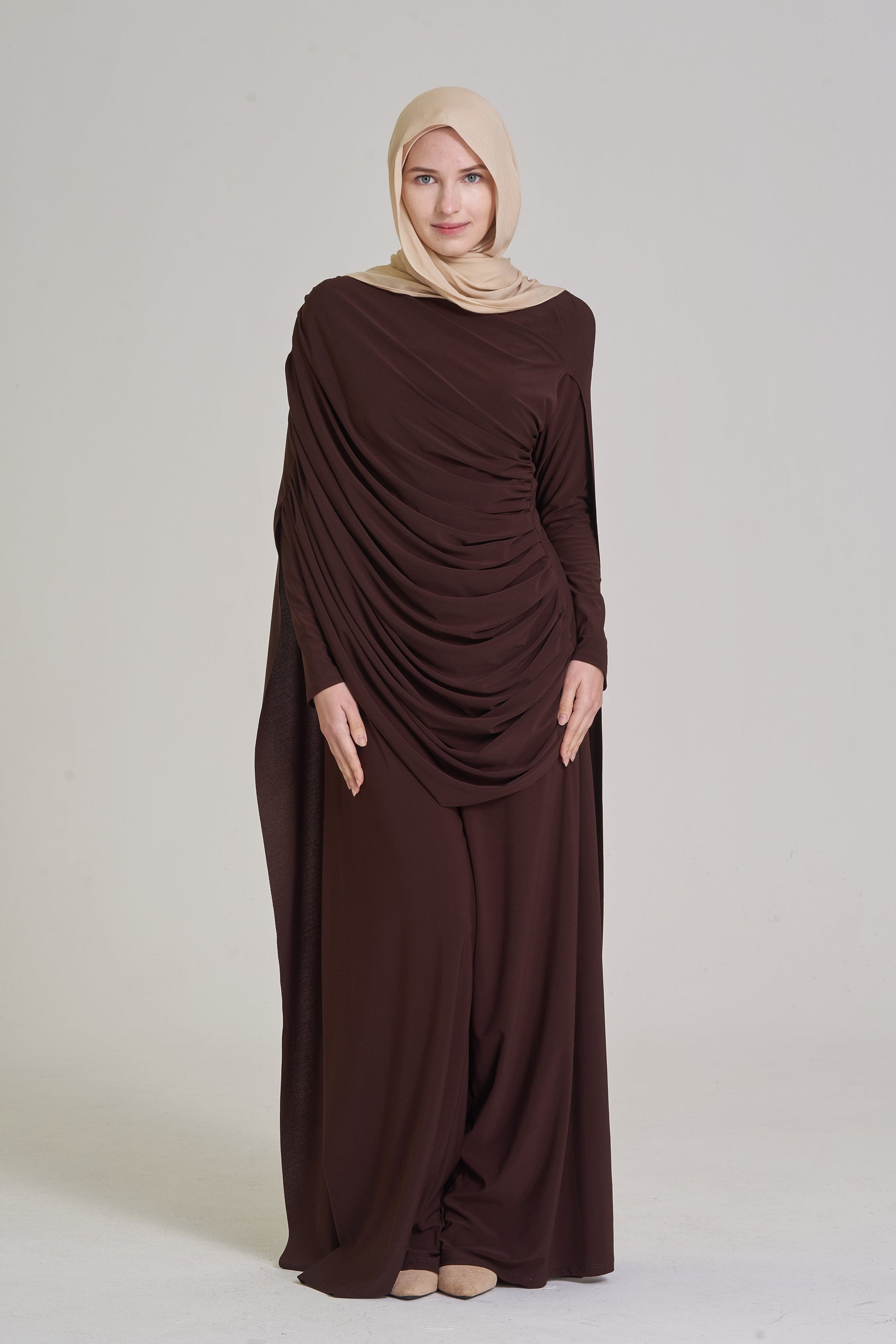 A modern two-piece set defined by gathered detailing and a flowing silhouette. Balanced and refined.